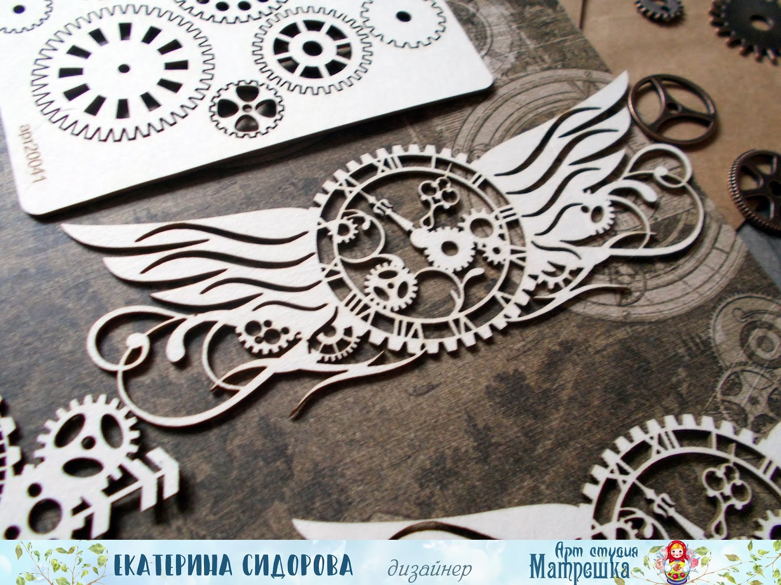 Знаете, что самое приятное для меня в этой посылке? Почему я решила отдельным постом написать о новинках? Ооох, это то, что дизайн стимпанк-чипборда полностью мой! То есть я сама разработала и нарисовала с нуля то, что с таким удовольствием сейчас сама разглядываю и вам показываю)) Каждая шестереночка, каждый завиток прорисован мной)) "Матрешка" воплотила мою идею, подредактировала для резки и вуаля - я с радостью призываю попробовать эту красоту в деле!